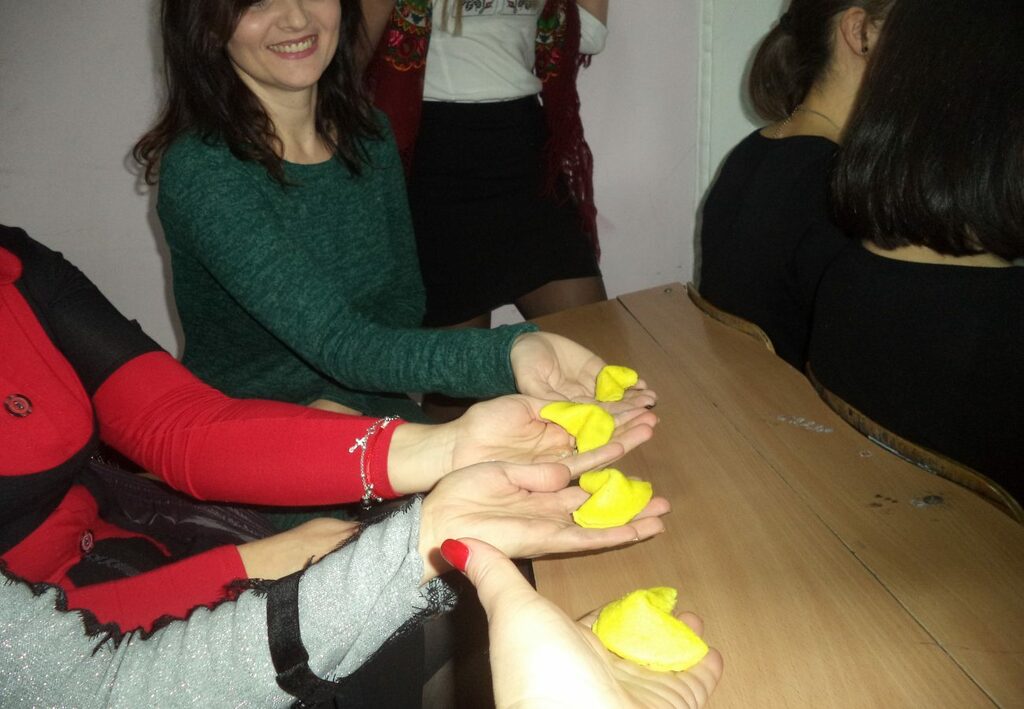 Всіх присутніх, дівчата, пригостили домашніми пирогами та цікавими (сучасними варениками) в яких кожен прочитав побажання на наступний рік.
