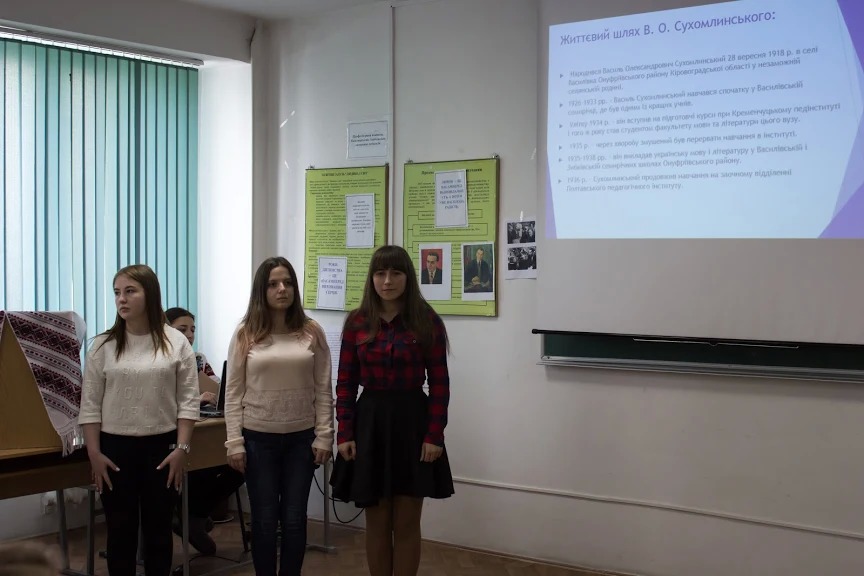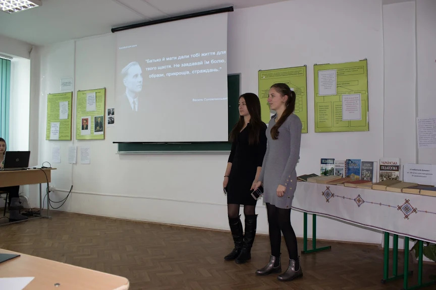 Студенти поділились власними дослідженнями на тему «Феномен дитинства у творчості В.О.Сухомлинського», «Казка, як засіб виховання дітей» та ін. Також, приємно вразили гостей інсценізацією казок великого педагога та високим рівнем підготовки. Крім цього, стіни педагогічного факультету прикрашають усі 100 порад учителю В. Сухомлинського, які нагадують кожному студенту і педагогу про важливість і цінність вчительської праці.