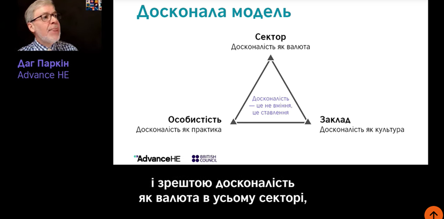 Під час Форуму досвідом підвищення досконалості викладання у Великій Британії поділився головний експерт з програм лідерства та менеджменту Advance HE Даг Паркін. Він запропонував Triangle model досконалості викладання, основною ідеєю якої є теза: «досконалість – це не вміння, це – ставлення».
