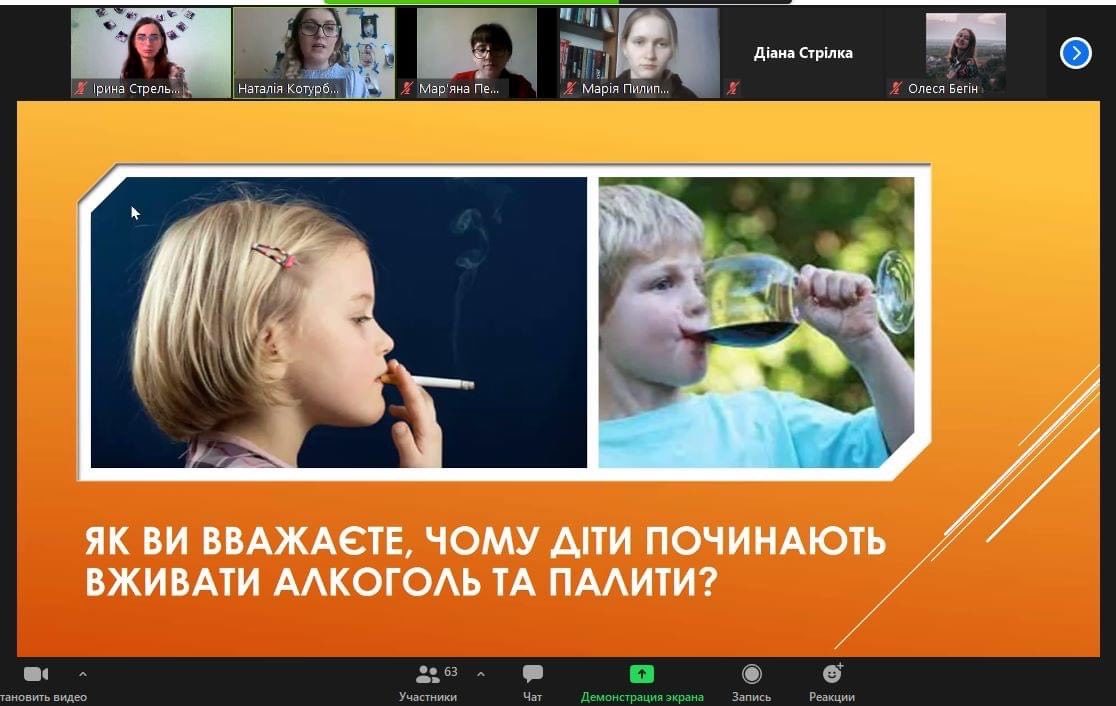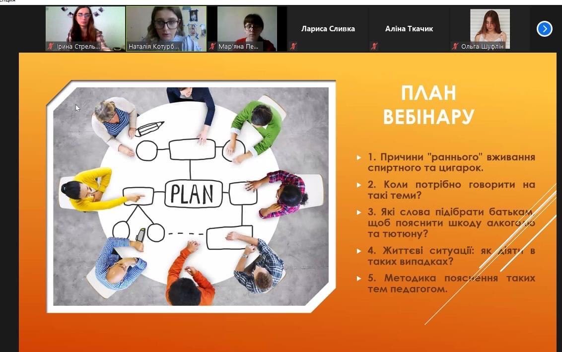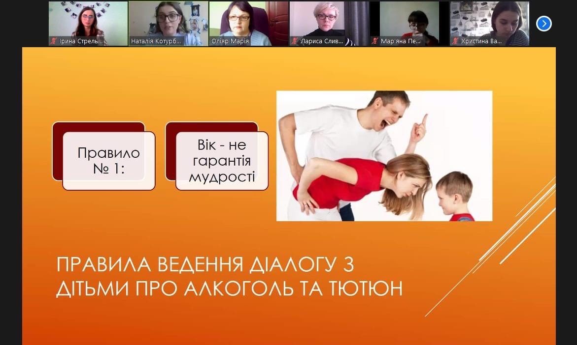 Розпочавши розмову із присутніми із запитання: «Коли, на Вашу думку, доцільно розпочинати обговорення з дитиною антиалкогольних і протинікотинових проблем?», Н. Котурбаш ознайомила учасників вебінару з правилами, які сприяють ефективному проведенню таких бесід, звернула увагу на «приховану» рекламу алкоголю і сигарет в засобах масової інформації і продемонструвала «нездоровий» контент деяких мультиплікаційних дитячих фільмів.