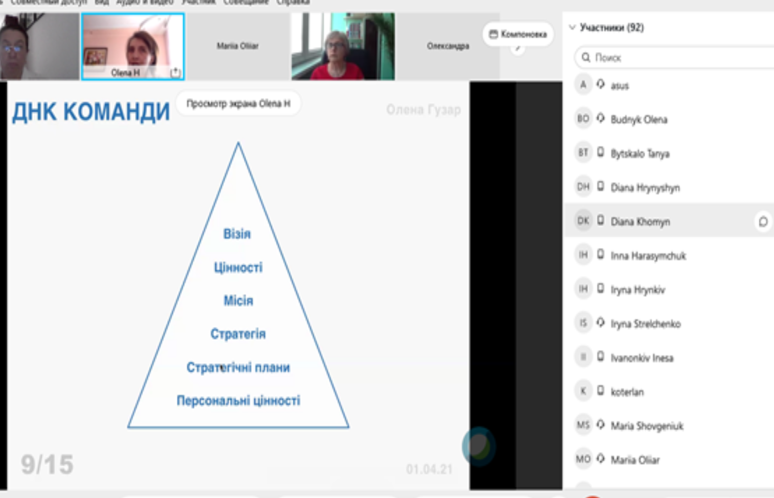 В онлайн-інтенсиві взяли участь понад 90 викладачів та студентів університету, що свідчить про актуальність питань, які обговорювались: вагомість і суть уміння комунікувати у сучасному суспільстві; комунікативний потенціал керівника;  особистісні характеристики, яких набуває особа  у процесі взаємодії з іншими людьми та/чи під час управлінського спілкування; ДНК колективу; егоїзм і екоїзм та ін.  Базис комунікативної компетентності спікер змоделювала у вигляді рівностороннього трикутника, у вершинах якого  – довіра, емпатія та раціональне мислення.
