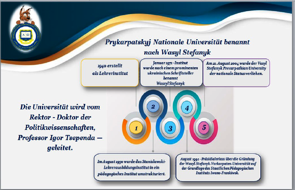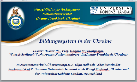 У рамках програми академічної мобільності проректор з науково-педагогічної роботи, професорка кафедри соціальної педагогіки та соціальної роботи Галина Михайлишин провела гостьову лекцію для студентів та науково-педагогічних працівників Університету UNI Koblenz-Landau (Німеччина) на тему «Сучасна система освіти України». З приємністю представила Прикарпатський національний університет імені Василя Стефаника, його досягнення в науці, міжнародному співробітництві та особливості роботи в умовах воєнного стану.