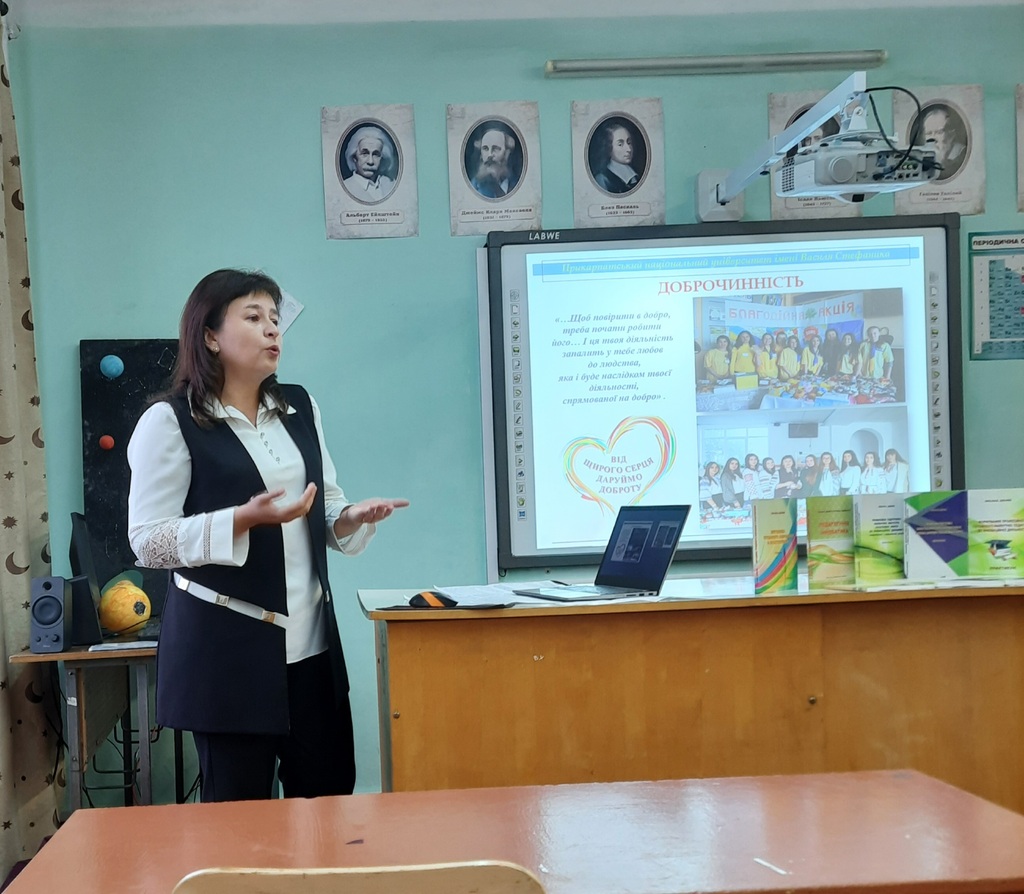 Цікавою для майбутніх абітурієнтів була інформація про студентське життя на педагогічному факультеті. Оксана Петрівна презентувала фотоматеріали результатів навчально-виховної діяльності здобувачів вищої освіти, їхньої науково-дослідницької та волонтерської роботи.