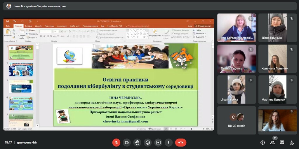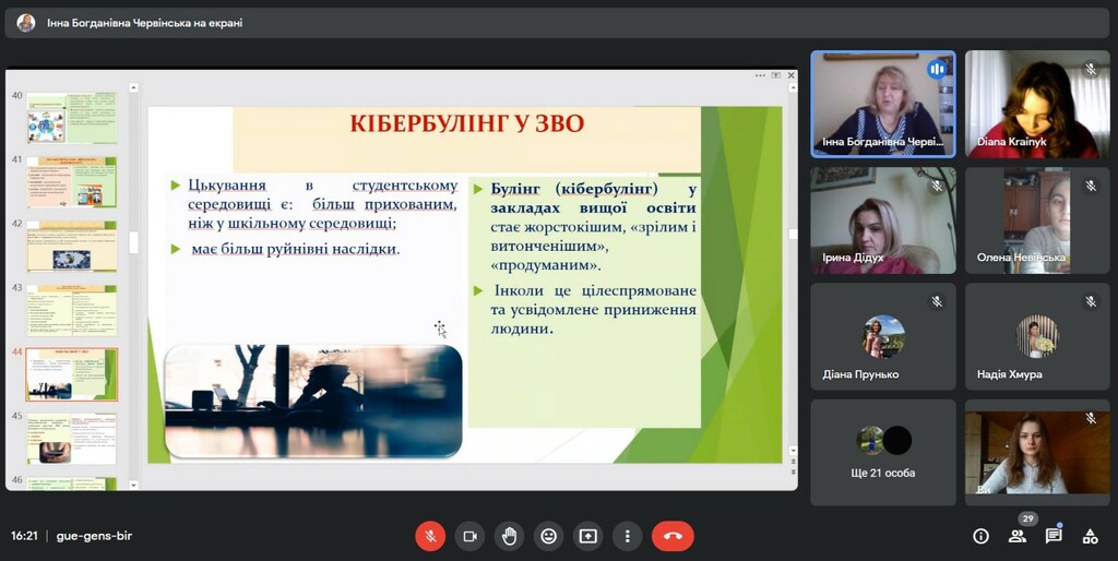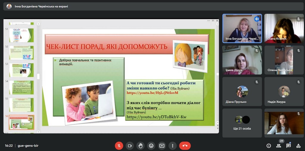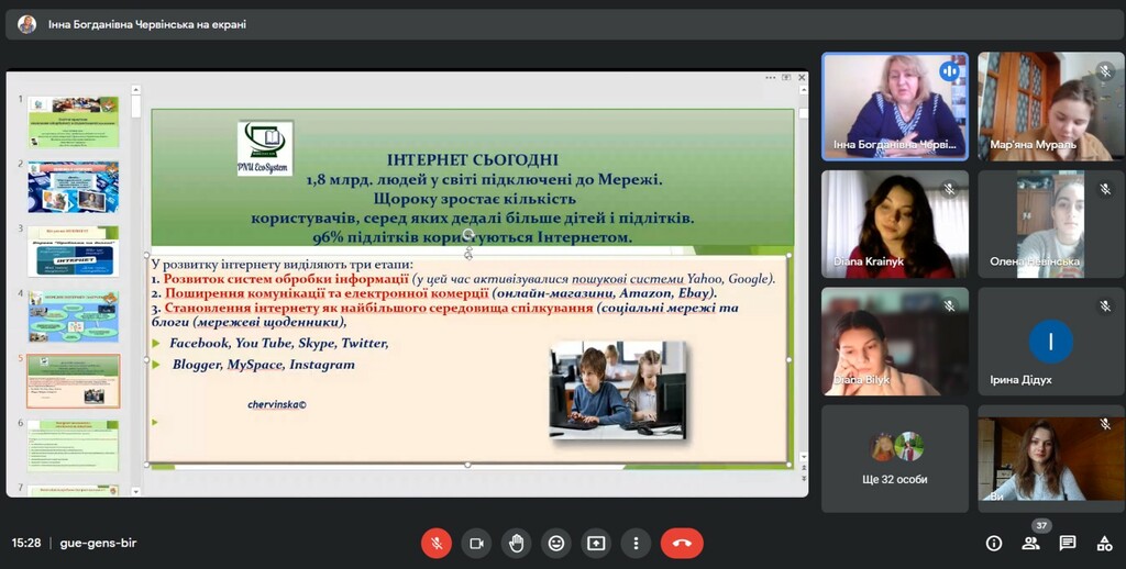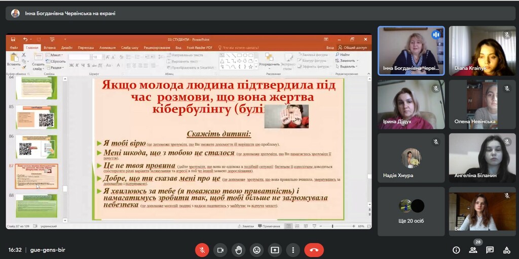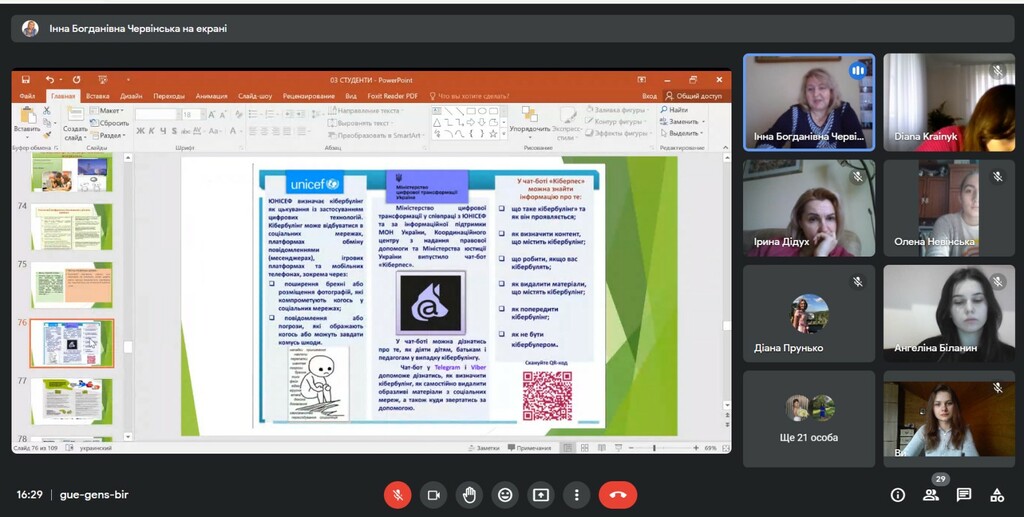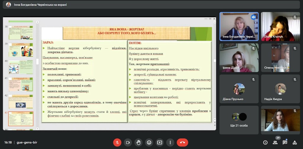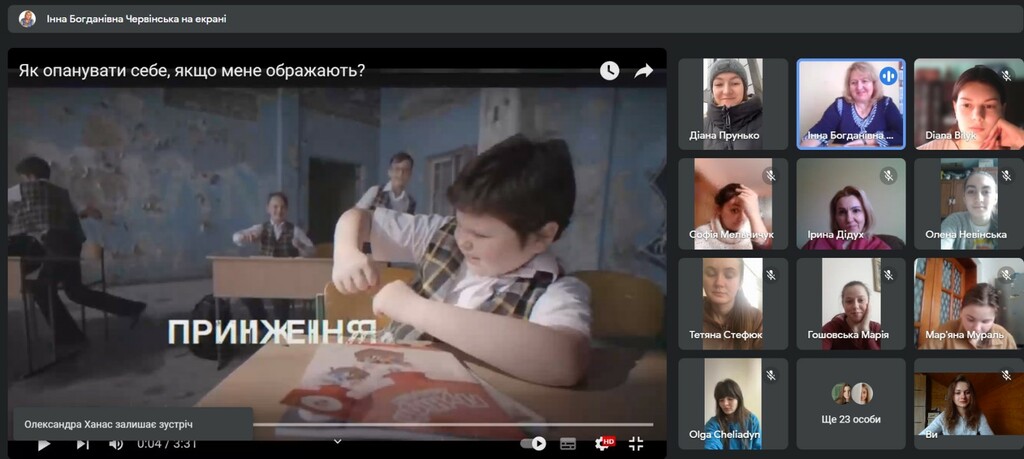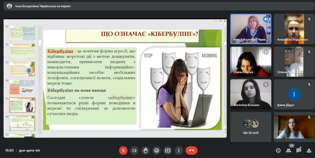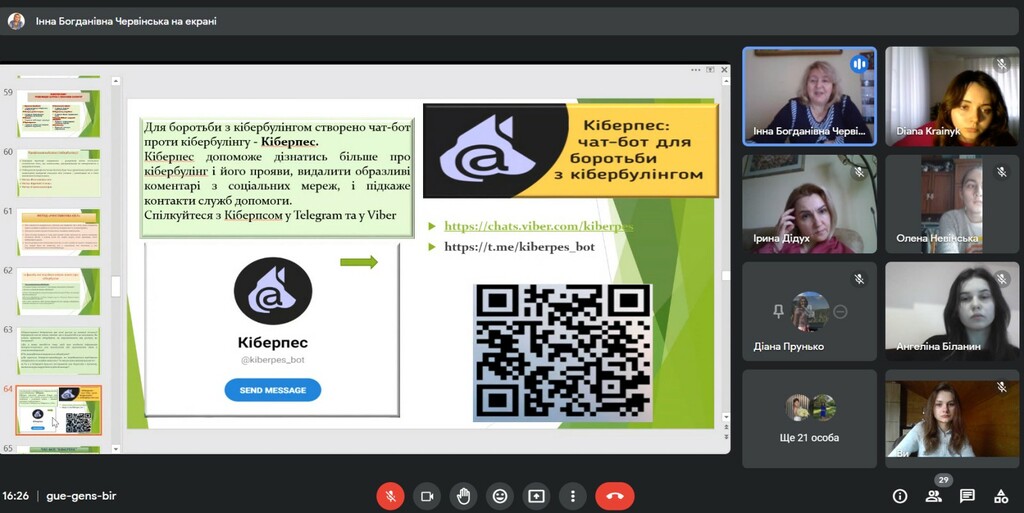 Вебінар був неймовірно цікавим, студенти активно брали участь в обговоренні, ставили запитання і пропонували своє бачення вирішення проблем, з якими можна зіткнутися у “Всесвітньому павутинні”, формулювали правила безпечного Інтернет-користувача. Інна Богданівна поділилась добіркою повчальних та позитивних анімацій, порад, які допоможуть. Дала посилання на сайт чат-боту для боротьби з кібербулінгом – “Кіберпес”, де можна дізнатись про те, як діяти дітям, батькам і педагогам у випадку кібербулінгу.