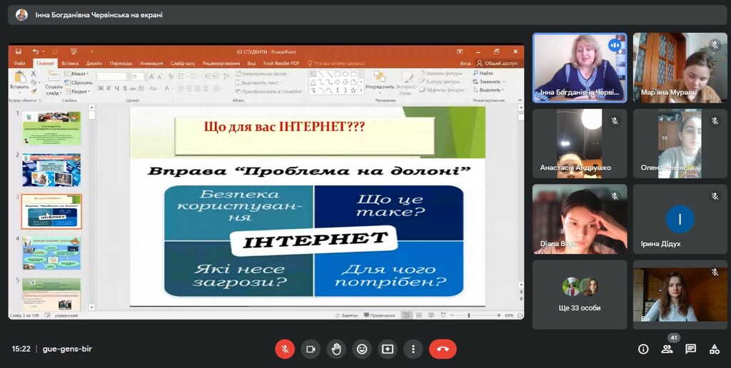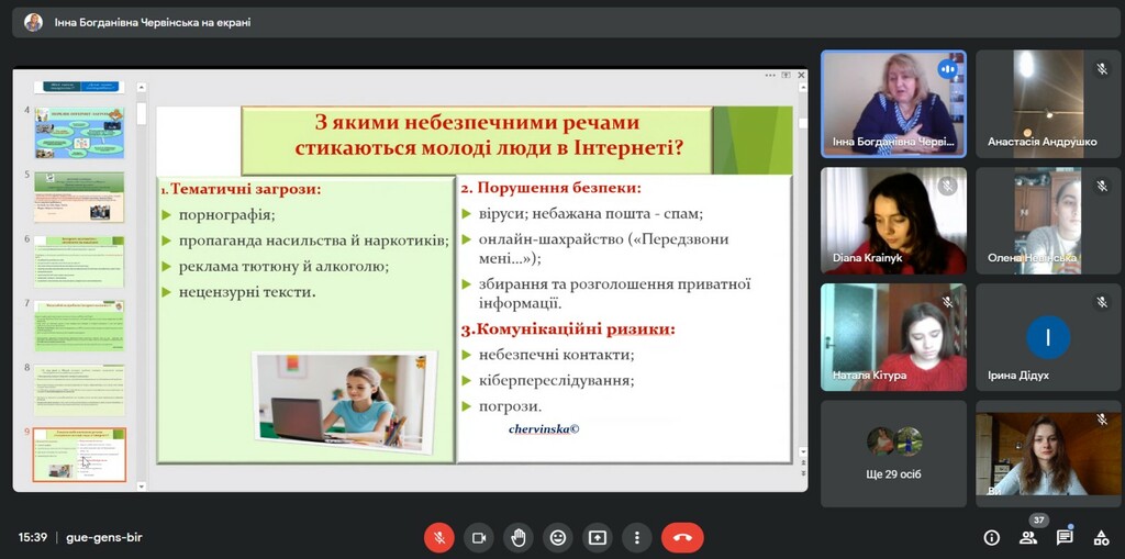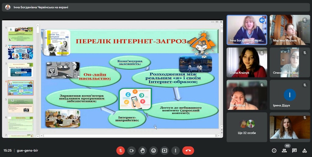 Студенти  педагогічного факультету активно долучились до онлайн-вебінару. Прослухавши цікаву доповідь та переглянувши пізнавальну презентацію, учасники мали змогу почерпнути актуальну інформацію та визначити перелік інтернет-загроз: он-лайн насильство, комп’ютерна залежність, інтернет-шахрайство, розходження між реальним “я” і своїм інтернет-образом, доступ до небажаного контенту, кібербулінг та його наслідки.