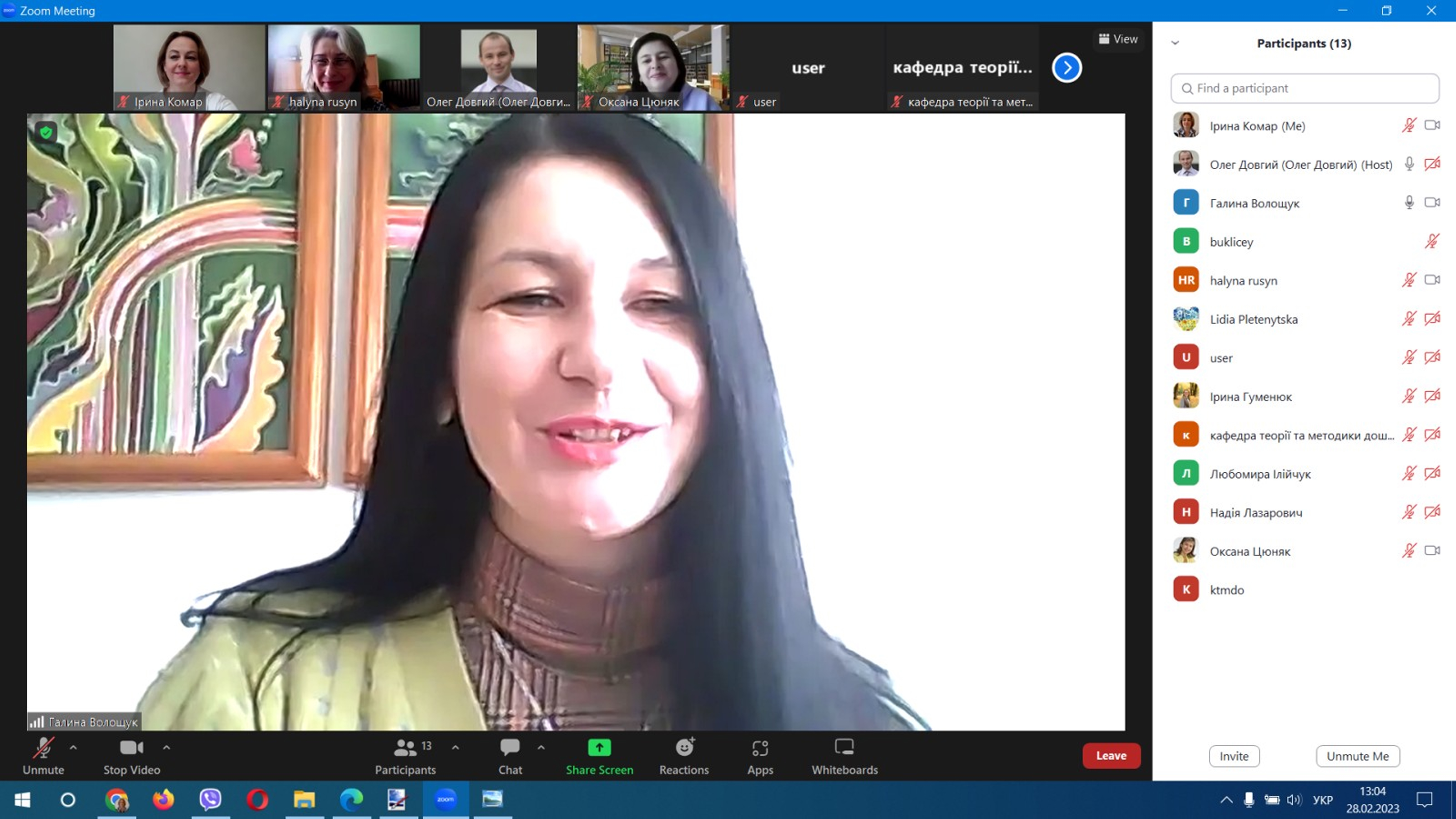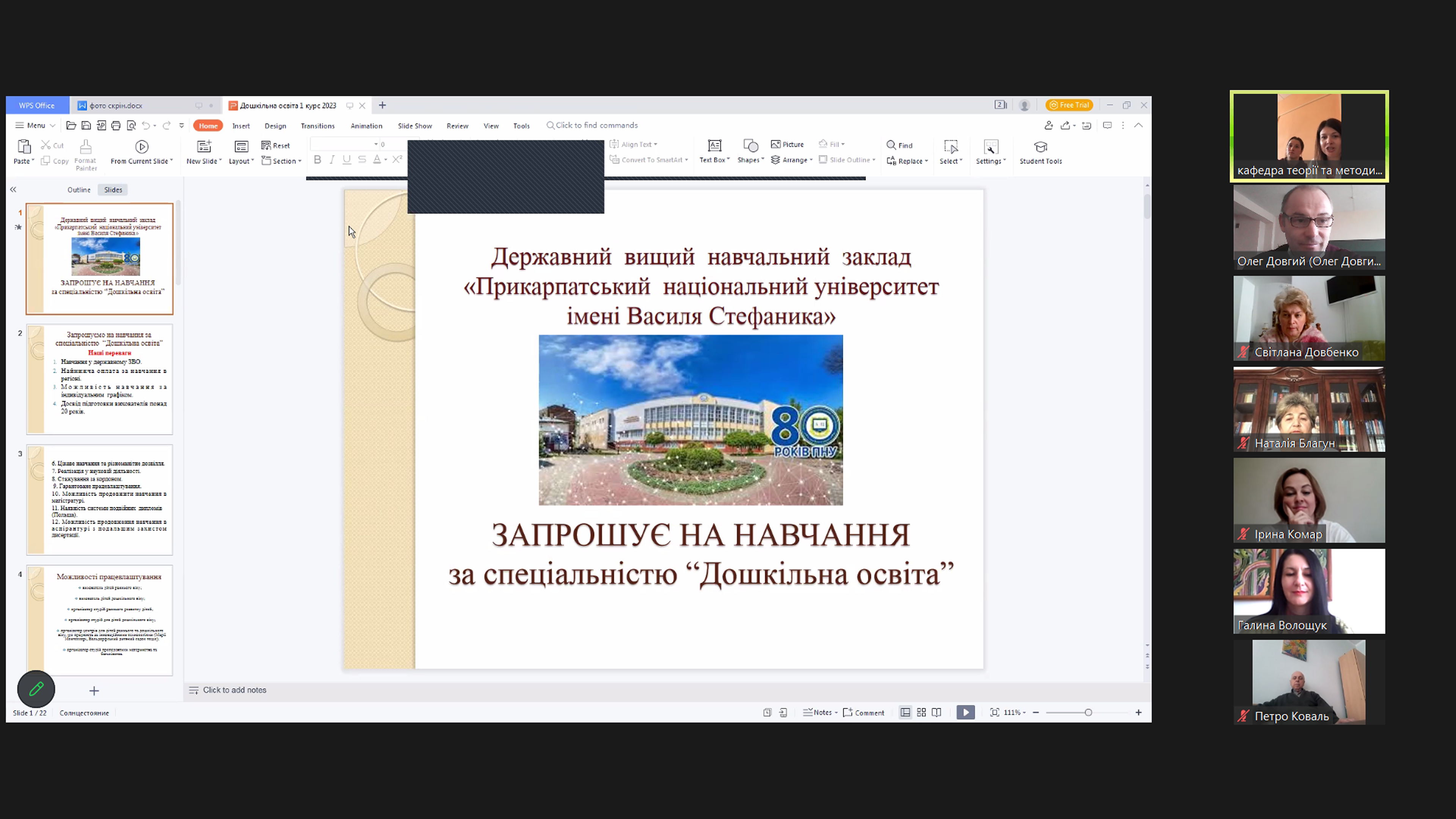 Провідний фахівець Інституту післядипломної освіти та довузівської підготовки, Галина Михайлівна Волощук, виступила першою від Прикарпатського національного університету імені Василя Стефаника. Галина Михайлівна коротко подала основну інформацію про університет: величезний потенціал, позитивний вплив на розвиток регіону, високі показники рейтингів, підготовчі курси тощо. Також Галина Михайлівна повідомила, що як тільки будуть затверджені правила прийому в університет у 2023 році, то університет організує День відкритих дверей у офлайн та онлайн форматах і надасть детальну інформацію щодо цього.