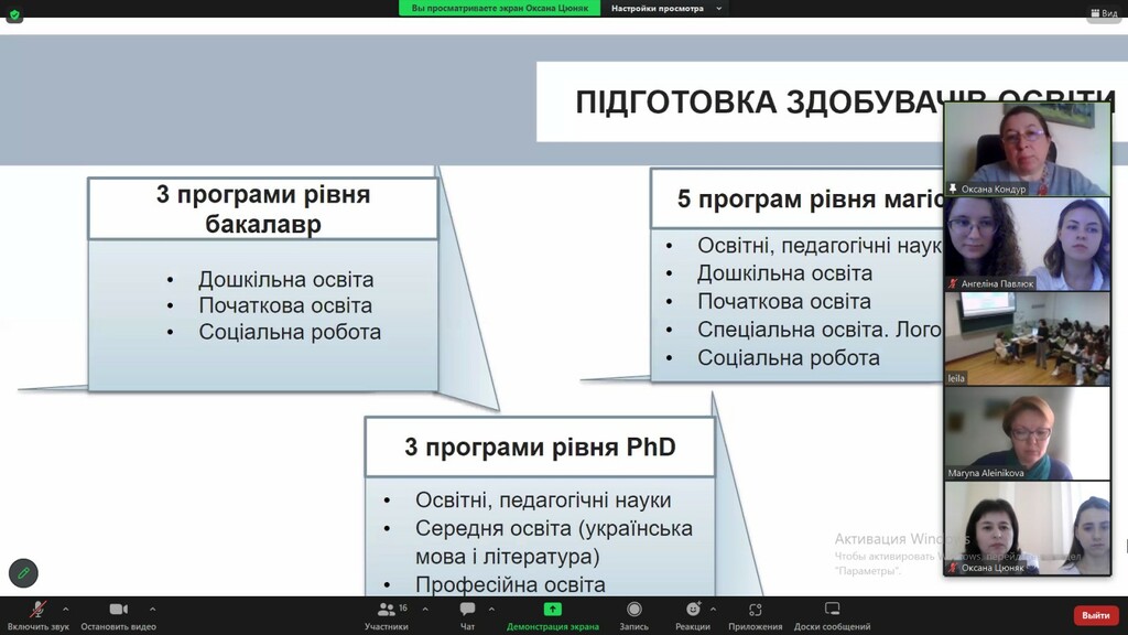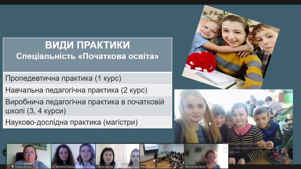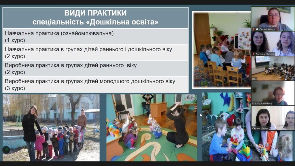 Професорка О. Цюняк поділилася із зарубіжними колегами досвідом організації практичної підготовки студентів спеціальностей «Дошкільна освіта » й «Початкова освіта». Наголосила, що професійно-педагогічна підготовка майбутніх вихователів та вчителів – це складний, багатогранний і тривалий процес, який здійснюється впродовж усього періоду навчання студентів. Вона є важливою складовою освітнього процесу, проводиться з метою закріплення і поглиблення теоретичних знань, набуття практичних навичок у межах майбутньої спеціальності.