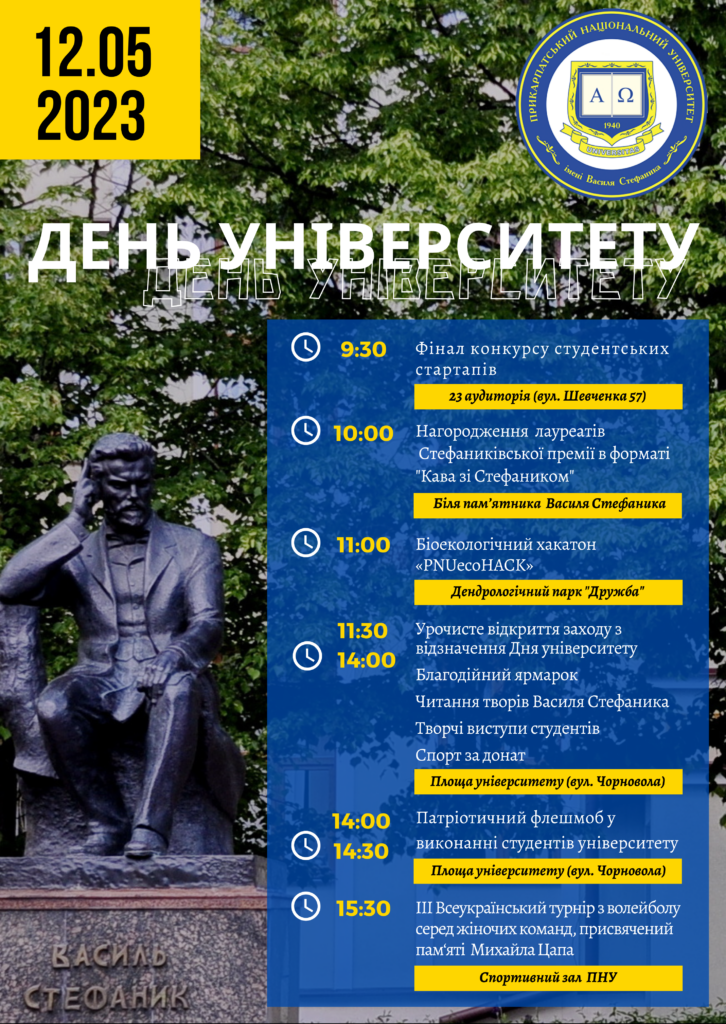 12 травня, у рамках відзначення Дня університету та Дня народження патрона університету Василя Стефаника, відбудеться низка заходів. Запрошуємо студентів, аспірантів, докторантів, викладачів, ветеранів, працівників, випускників, гостей, друзів, партнерів та представників ЗМІ взяти участь.