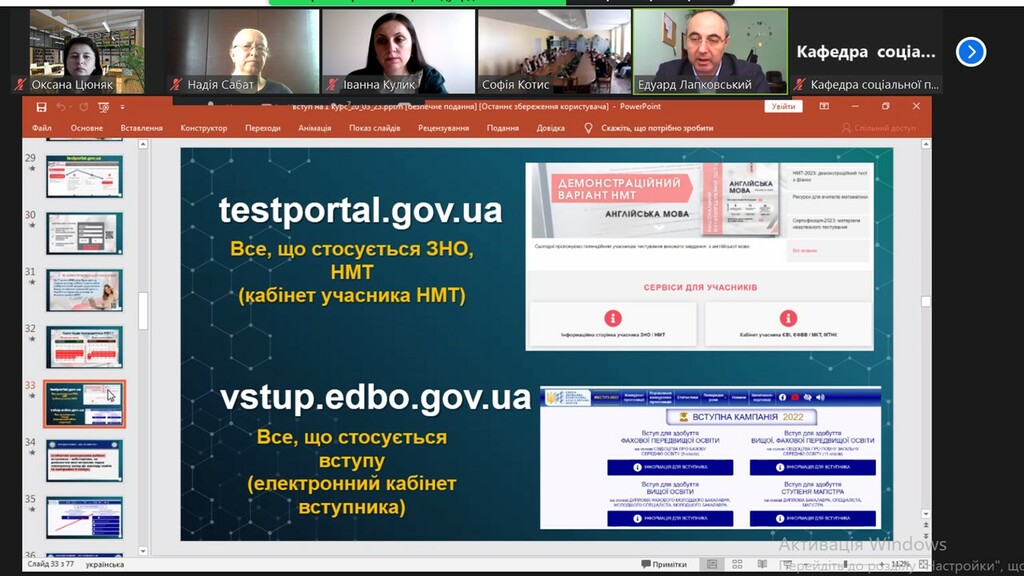9 травня з ініціативи викладачів кафедри соціальної педагогіки та соціальної роботи проведено профорієнтаційну зустріч онлайн зі студентами Чортківського гуманітарно-педагогічного фахового коледжу імені Олександра Барвінського – освітнього закладу зі славними традиціями, якого з Прикарпатським національним університетом імені Василя Стефаника пов’язує багаторічна плідна співпраця. Учасників зустрічі привітала кандидат педагогічних наук, доцент, завідувач кафедри соціальної педагогіки та соціальної роботи Іванна Кулик, до слова, випускниця Чортківського педагогічного училища.