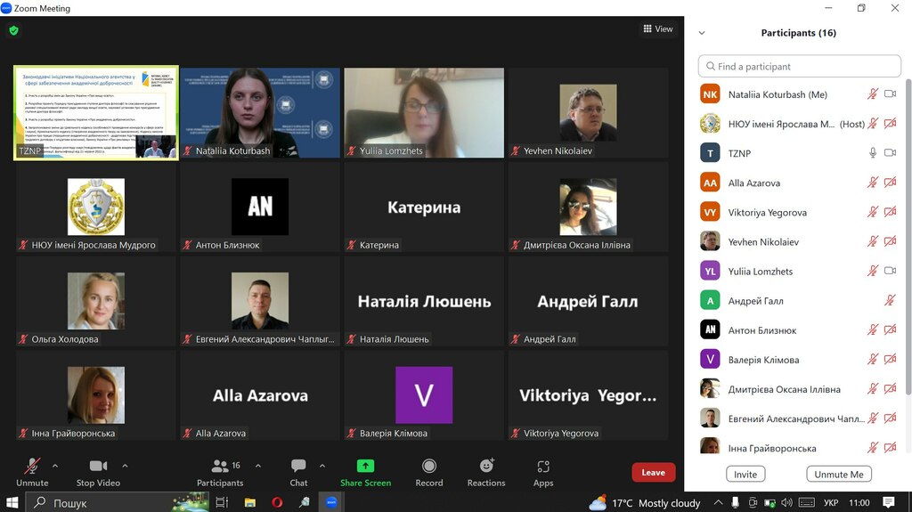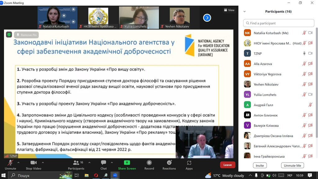 15 червня 2023 року на базі Національного юридичного університету імені Ярослава Мудрого відбулася конференції «Академічна доброчесність у вищій освіті: виклики та інструменти впливу». Із вітальними словами виступили ректор Університету Анатолій Павлович Гетьман, голова підкомітету з питань вищої освіти Комітету Верховної Ради України з питань освіти, науки та інновацій Юлія Миколаївна Гришина, начальник Харківської обласної військової адміністрації Олег Васильович Синєгубов, голова Харківської обласної ради Тетяна Петрівна Єгорова-Луценко і перший заступник Харківського міського голови Олександр Миколайович Новак.