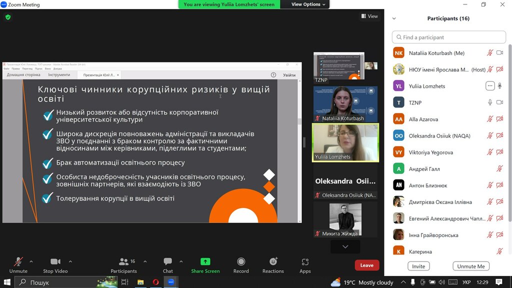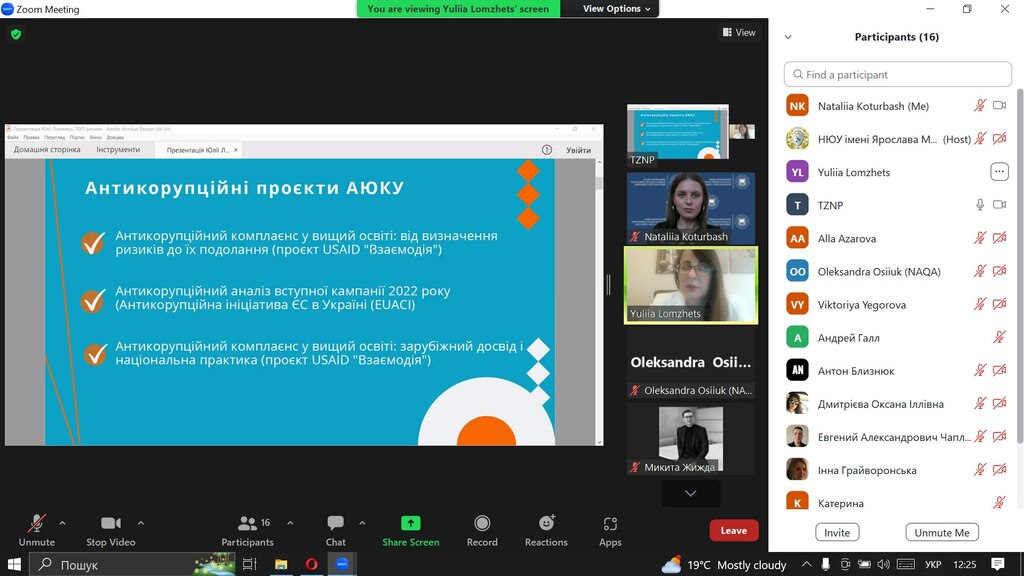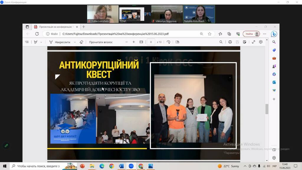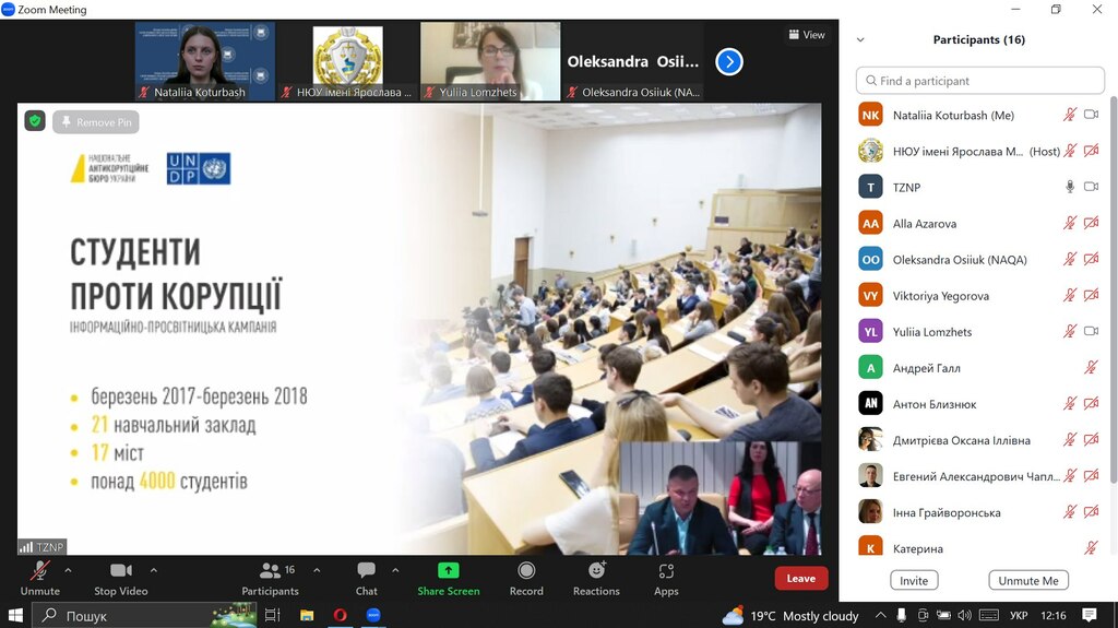Доповідачка репрезентувала вже реалізовані антикорупційні проєкти, до яких були залучені студенти Прикарпатського національного університету імені Василя Стефаника: «Підтримка безпечних середовищ для розвитку молоді в Україні», мета якого підготувати освітніх експертів з числа здобувачів вищої освіти (проєкт триває від березня 2023 року); «Антикорупційний квест» – механізм, що дозволяє зрозуміти здобувачам, як протидіяти корупції та академічній недоброчесності у стінах свого закладу вищої освіти (23 травня 2023 року); п’ятиденна літня школа «UAS Camp 2023» (23-27 червня 2023 року, смт. Верховина), де студенти зі всієї України зможуть у неформальній обстановці формувати прозоре освітнє середовище, починаючи з себе.
