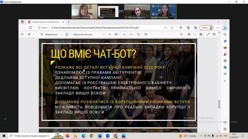 Наталія Котурбаш також зауважила, що важливим етапом для кожного ЗВО – це вступна кампанія і варто взяти до уваги всі позитивні та негативні тенденції вступної кампанії 2022 року. Було озвучено ряд рекомендації для органів студентського самоврядування: створення консультаційних кабінетів, реальне залучення представників ОСС до вступної кампанії, присутність представників ОСС під час проведення вступних випробувань.