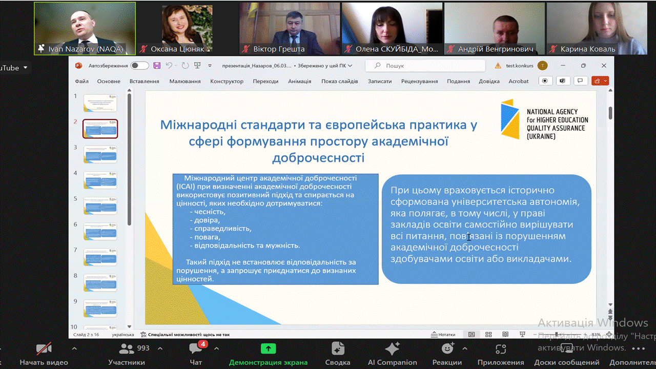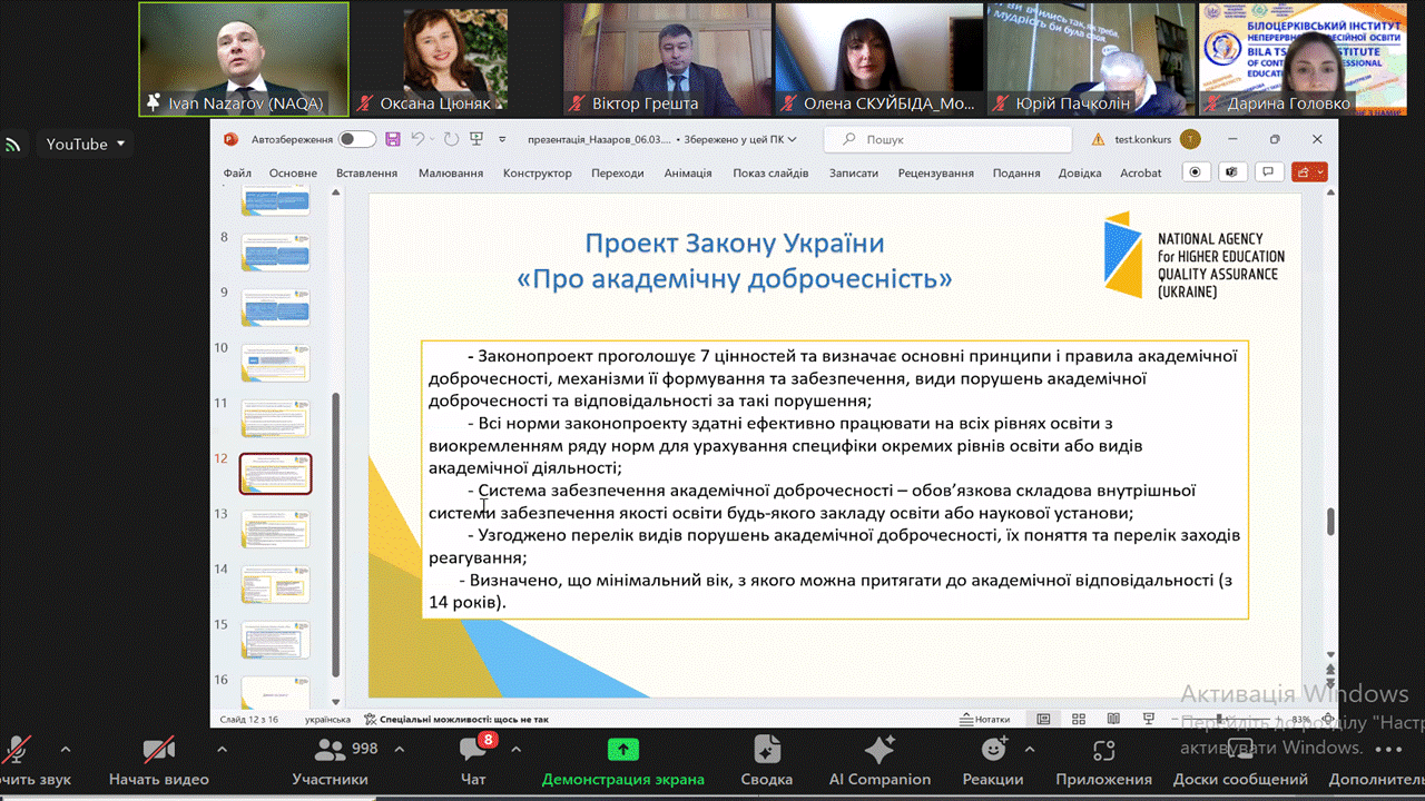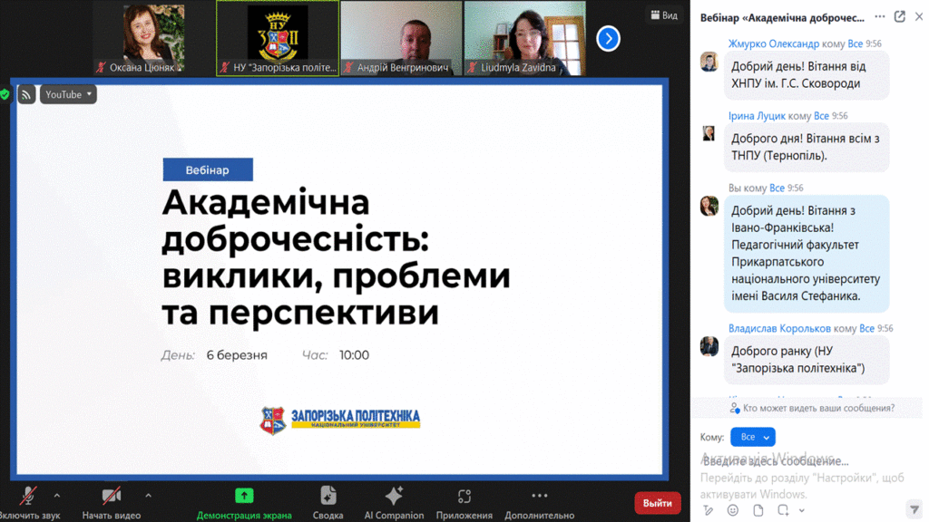 06 березня 2024 року викладачі, здобувачів вищої освіти, аспіранти спеціальності 015 Професійна освіта (за спеціалізаціями) педагогічного факультету Прикарпатського національного університету імені Василя Стефаника взяли участь у вебінарі «Академічна доброчесність: виклики, проблеми та перспективи», організованого Національним університетом «Запорізька політехніка».