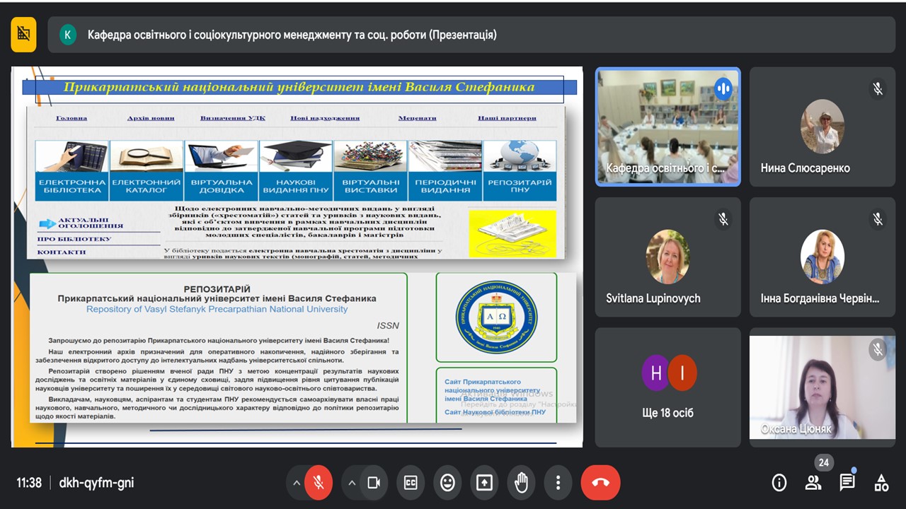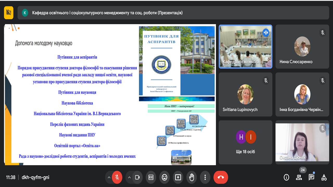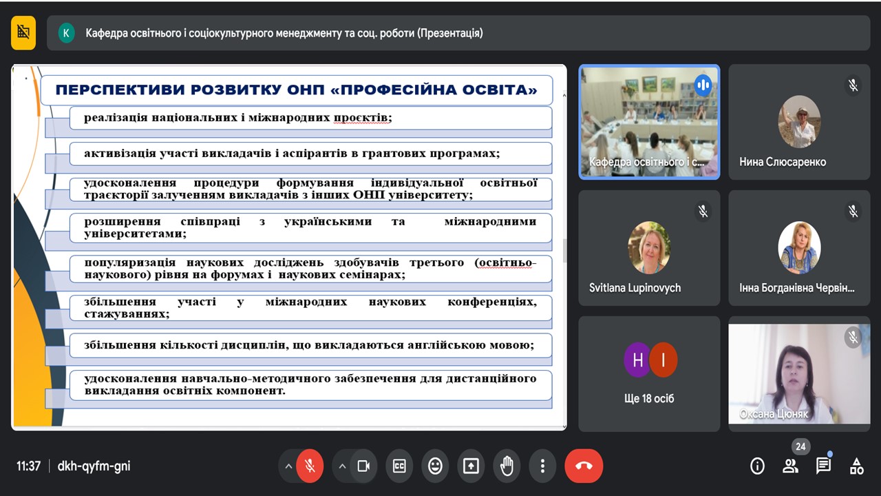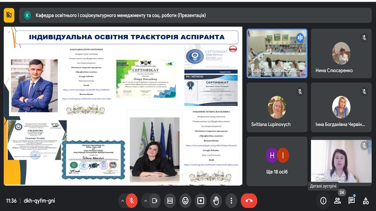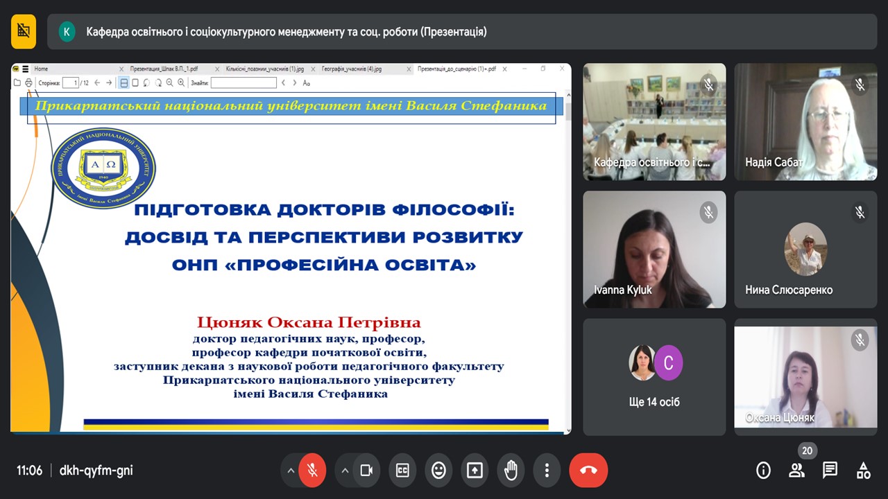 Професорка Оксана Цюняк висловила свої міркування щодо удосконалення підготовки докторів філософії з професійної освіти. У виступі Оксана Петрівна представила зміст, мету і цілі освітньо-наукової програми «Професійна освіта», що відповідають Стратегії розвитку Прикарпатського національного університету імені Василя Стефаника на 2020-2027 роки і співвідносяться з тенденціями розвитку європейської вищої освіти, де якість освіти забезпечується через інноваційність та науково-дослідницьку діяльність. Професорка зазначила, що навчання аспірантів здійснюється на основі поєднання навчальної, науково-дослідної діяльності, апробації результатів наукових досліджень, науково-педагогічної практики з використанням традиційних та інноваційних форм і методів навчання. Разом з тим, освітнє середовище університету є безпечним для життя та здоров’я здобувачів вищої освіти. Освітня підтримка реалізується шляхом забезпечення теоретичної, методичної і практичної підготовки здобувачів третього (освітньо-наукового) рівня вищої освіти, а також створення сприятливого психологічного клімату.