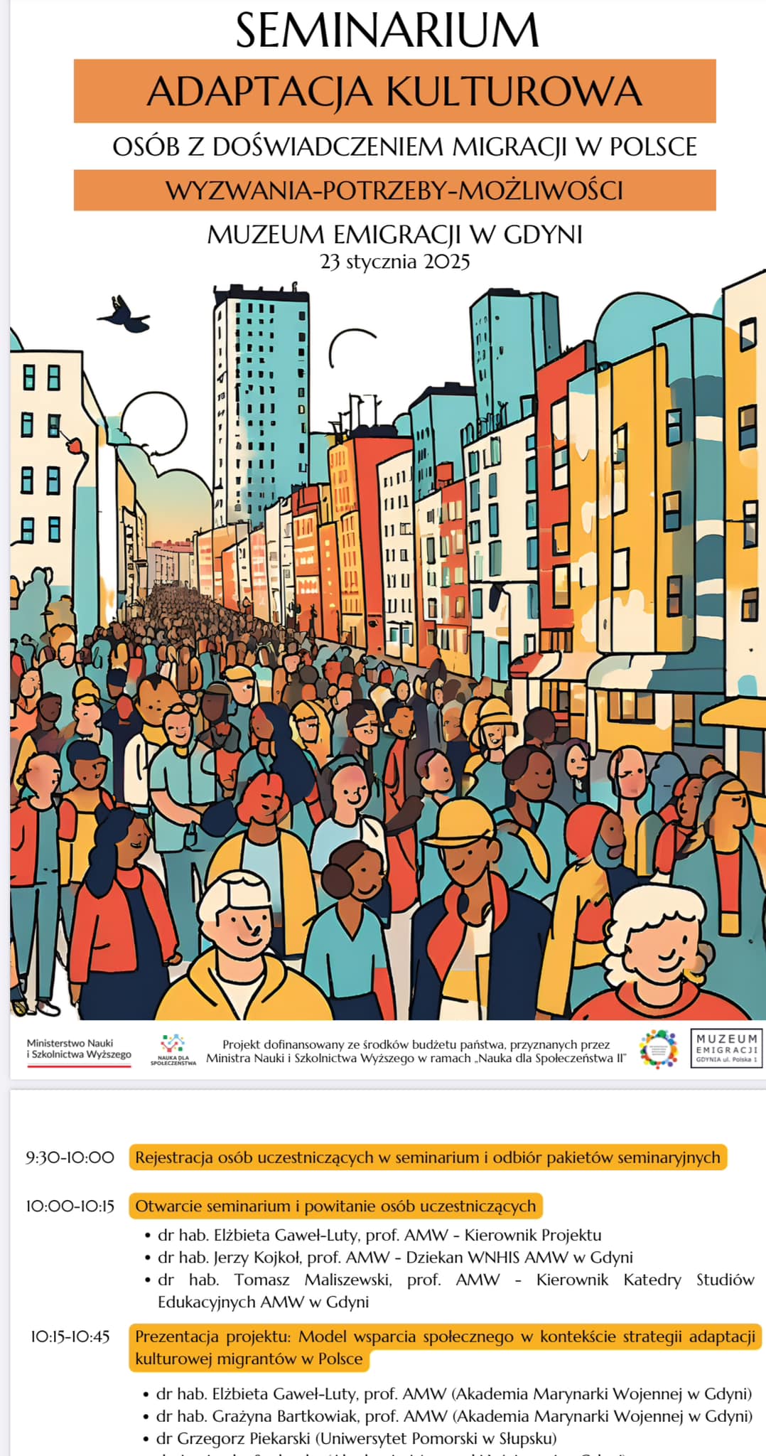 Організаторами заходу виступили Instytut Pedagogiki i Psychologii Uniwersytetu Pomorskiego w Słupsku i Wydział Nauk Humanistycznych i Społecznych Akademia Marynarki Wojennej у Гдині (Польща). Предметом обговорення були різні аспекти соціальної, культурної, освітньої, інформаційної, психологічної та ін.підтримки мігрантів з різних країн, зокрема з України. Захід відбувся у рамках проєкту, який фінансується Міністерством освіти Польщі.