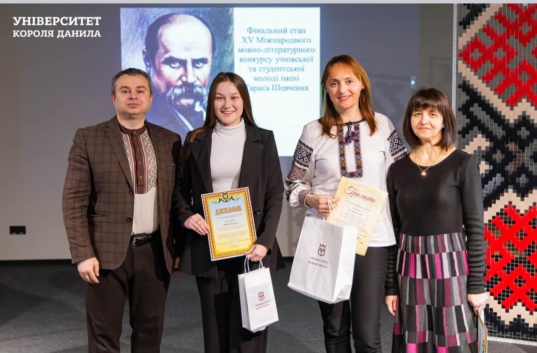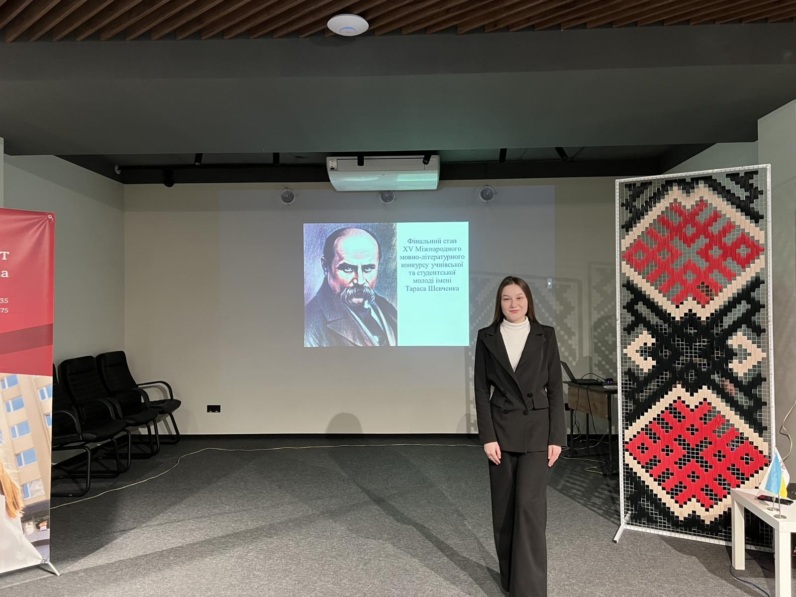 15 лютого відбувся фінальний етап і нагородження переможців ІІІ етапу Міжнародного мовно-літературного конкурсу учнівської та студентської молоді імені Тараса Шевченка. Педагогічний факультет гідно представила Мар’яна Бойко – студентка 3 курсу спеціальності “Початкова освіта”, яка на всіх етапах конкурсу продемонструвала глибокі знання творчості Шевченка, непохитну патріотичну позицію, вміння критично й креативно мислити, нестандартно й оригінально підходити до вирішення різних мовно-літературних завдань.