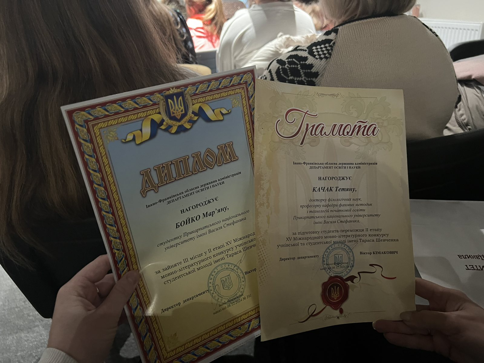Мар’яна Бойко нагороджена Дипломом ІІІ ступеня Департаменту освіти і науки Івано-Франківської обласної державної адміністрації, а її наукова керівниця – Тетяна Качак, докторка філологічних наук, професорка кафедри початкової освіти та освітніх інновацій, – грамотою за підготовку студента-переможця.