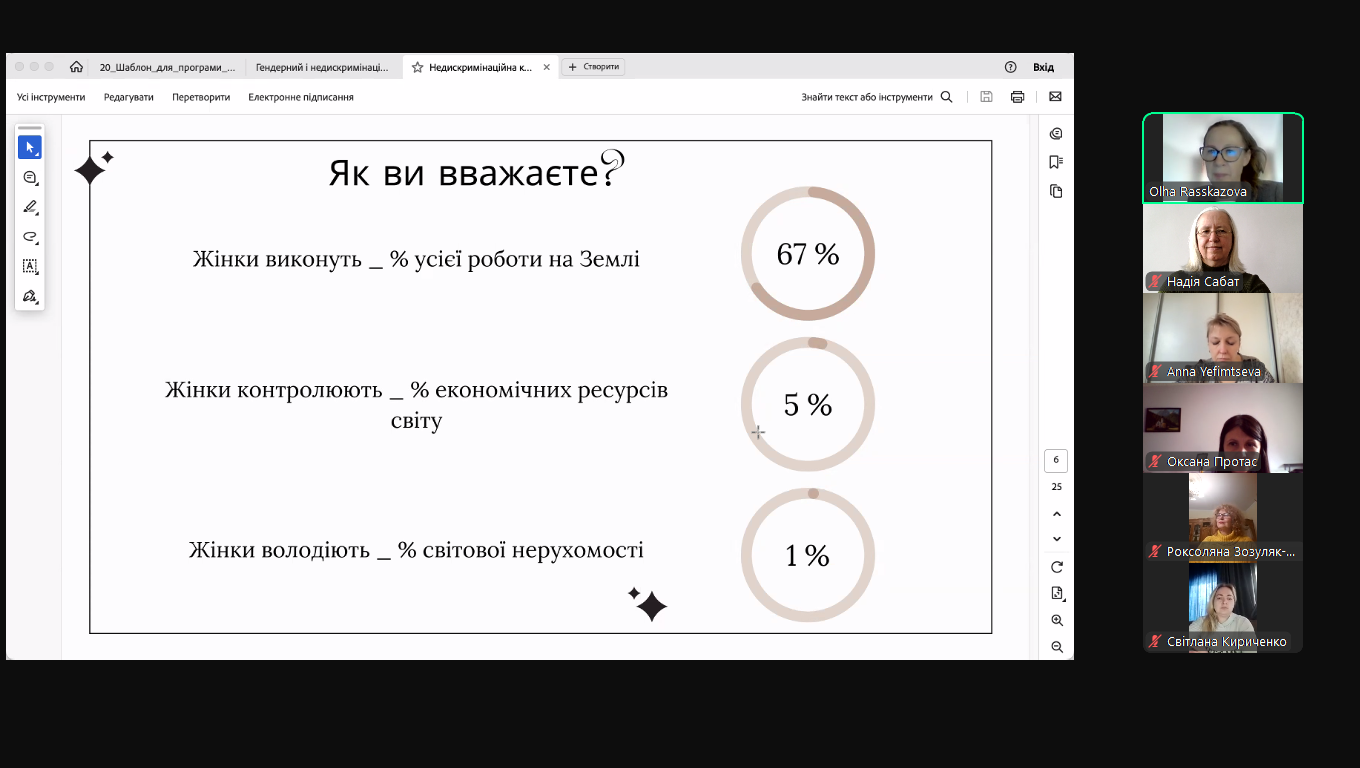В. о. завідувача кафедри професорка Роксоляна Зозуляк-Случик у вступному слові підкреслила, що в сучасних умовах глобальних викликів ключовим завданням освіти стає формування загальнолюдських цінностей та набуття особистісного досвіду їх усвідомлення учасниками освітнього процесу. У зв’язку з цим один із пріоритетів діяльності кафедри соціальної педагогіки та соціальної роботи, а також університету загалом – забезпечення недискримінаційного підходу в освіті.