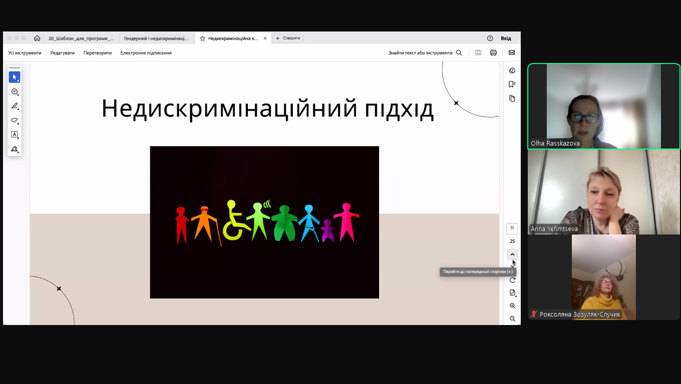 17 березня 2025 року була проведена гостьова лекція на тему: «Поступ України у становленні недискримінаційного та інклюзивного підходів в освіті і сфері соціальної роботи у час війни», організована кафедрою соціальної педагогіки та соціальної роботи. Спікерки: Ольга Рассказова, докторка педагогічних наук, професорка кафедри соціальної роботи Комунального закладу «Харківська гуманітарно-педагогічна академія», керівниця Лабораторії соціально-емоційного та етичного навчання ГО «ЕдКемп Україна», членкиня експертної групи з проведення антидискримінаційної експертизи з надання грифів навчальній літературі та навчальним програмам; членкиня робочої групи з питань політики гендерної рівності та протидії дискримінації в освіті Міністерства освіти і науки України, сертифікована експертка і тренерка з недискримінаційного підходу в освіті; Ганна Єфімцева, головна фахівчиня ГО «ЕдКемп Україна», членкиня експертної комісії з проведення антидискримінаційної експертизи з надання грифів навчальній літературі та навчальним програмам, сертифікована експертка і тренерка з недискримінаційного підходу в освіті, психологиня.