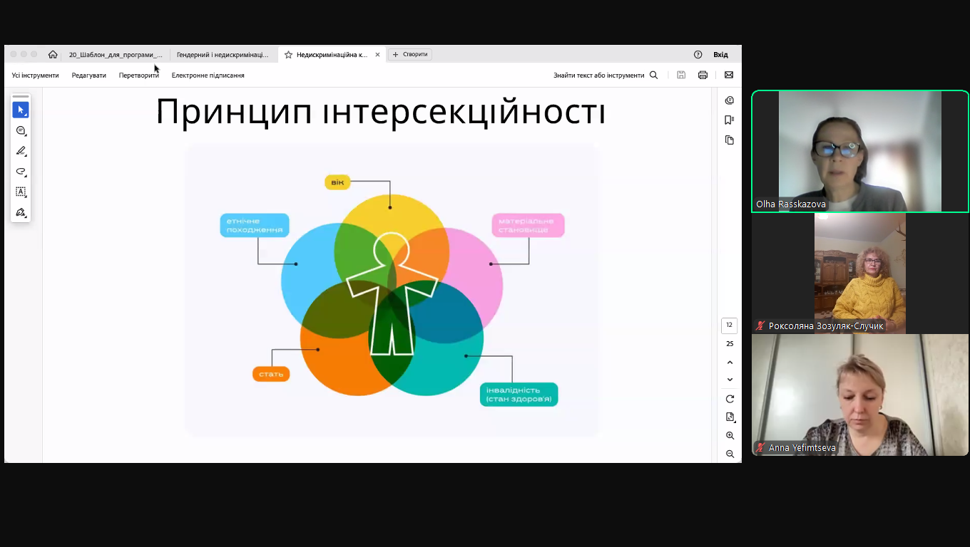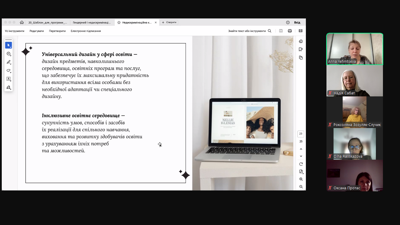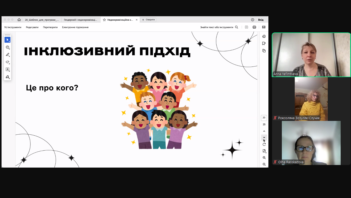 Лекторки розкрили особливості гендерного, недискримінаційного і інклюзивного підходів в освіті. Зазначили, що включення всіх людей до суспільства або спільноти можна досягти за допомогою універсального дизайну, який є інструментом забезпечення інклюзивного підходу у сфері освіти. Наведені статистичні дані, підбірка кейсів (у тому числі з освітнього контенту), залученість до інтерактивних вправ дозволили присутнім краще усвідомити особливості кожного з підходів, поняття стереотипів, інтерсекційності, принципів універсального дизайну тощо.