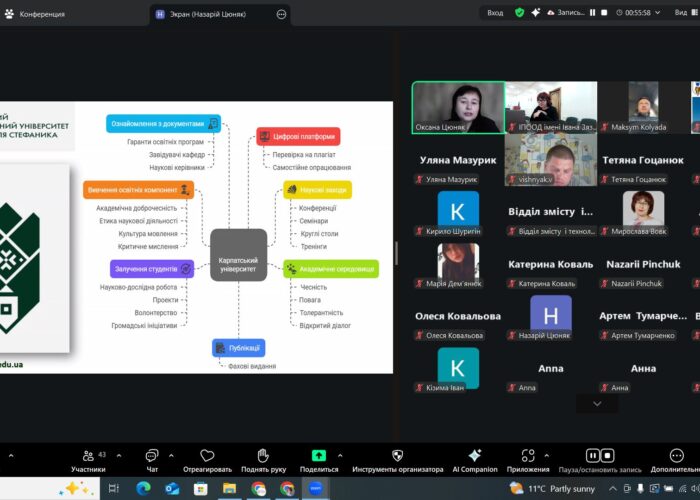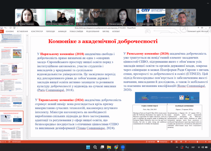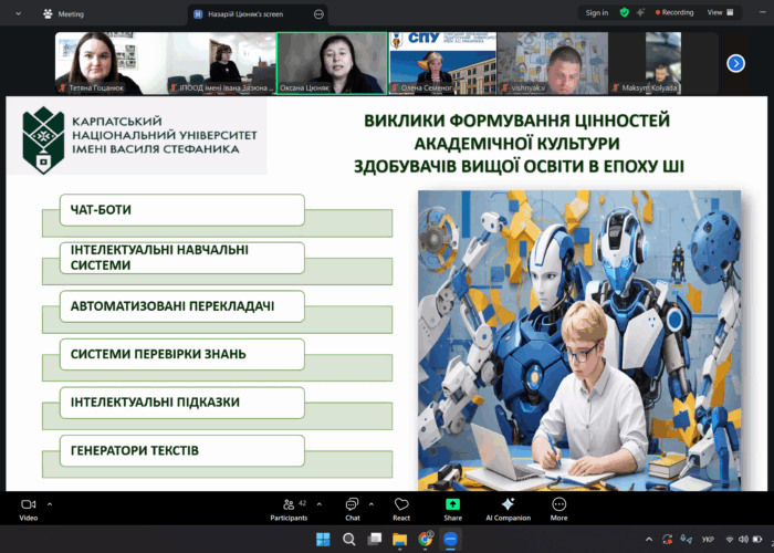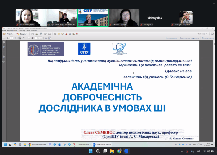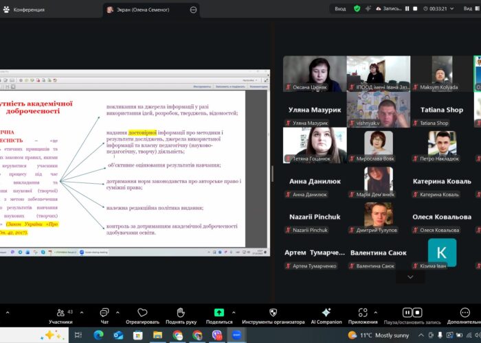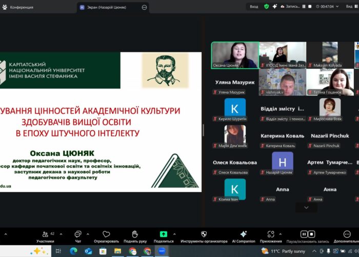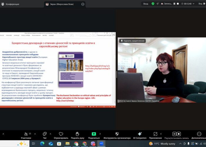 У межах реалізації Програми внутрішньої академічної мобільності в Інституті педагогічної освіти і освіти дорослих імені Івана Зязюна НАПН України професорка кафедри початкової освіти та освітніх інновацій, заступниця декана з наукової роботи педагогічного факультету Оксана ЦЮНЯК виступила на  освітньо-науковому заході «Академічна доброчесність дослідника: виклики в умовах штучного інтелекту». Захід був спрямований на представлення законодавчо-нормативних регулятивів, окреслення викликів та рекомендацій щодо використання ШІ на засадах етичних принципів.