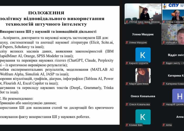 Доповідачка представила зміст Положення про політику відповідального використання технологій штучного інтелекту, схваленого Вченою радою університету, наголошуючи, що штучний інтелект має бути інструментом підтримки творчого процесу, а не засобом підміни інтелектуальної праці. Справжня цінність освіти полягає не у технологічних можливостях, а в глибокому осмисленні знань, етичному ставленні до навчання та відповідальності за власний інтелектуальний розвиток.