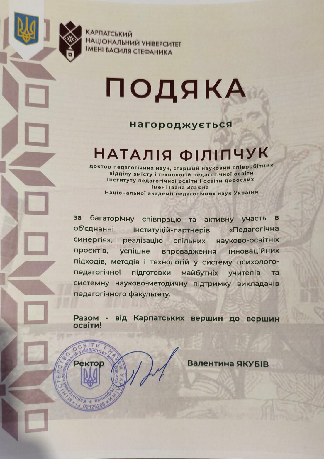 НАТАЛІЮ ФІЛІПЧУК − доктора педагогічних наук, старшого наукового співробітника відділу змісту і технологій педагогічної освіти Інституту педагогічної освіти і освіти дорослих імені Івана Зязюна Національної академії педагогічних наук України.