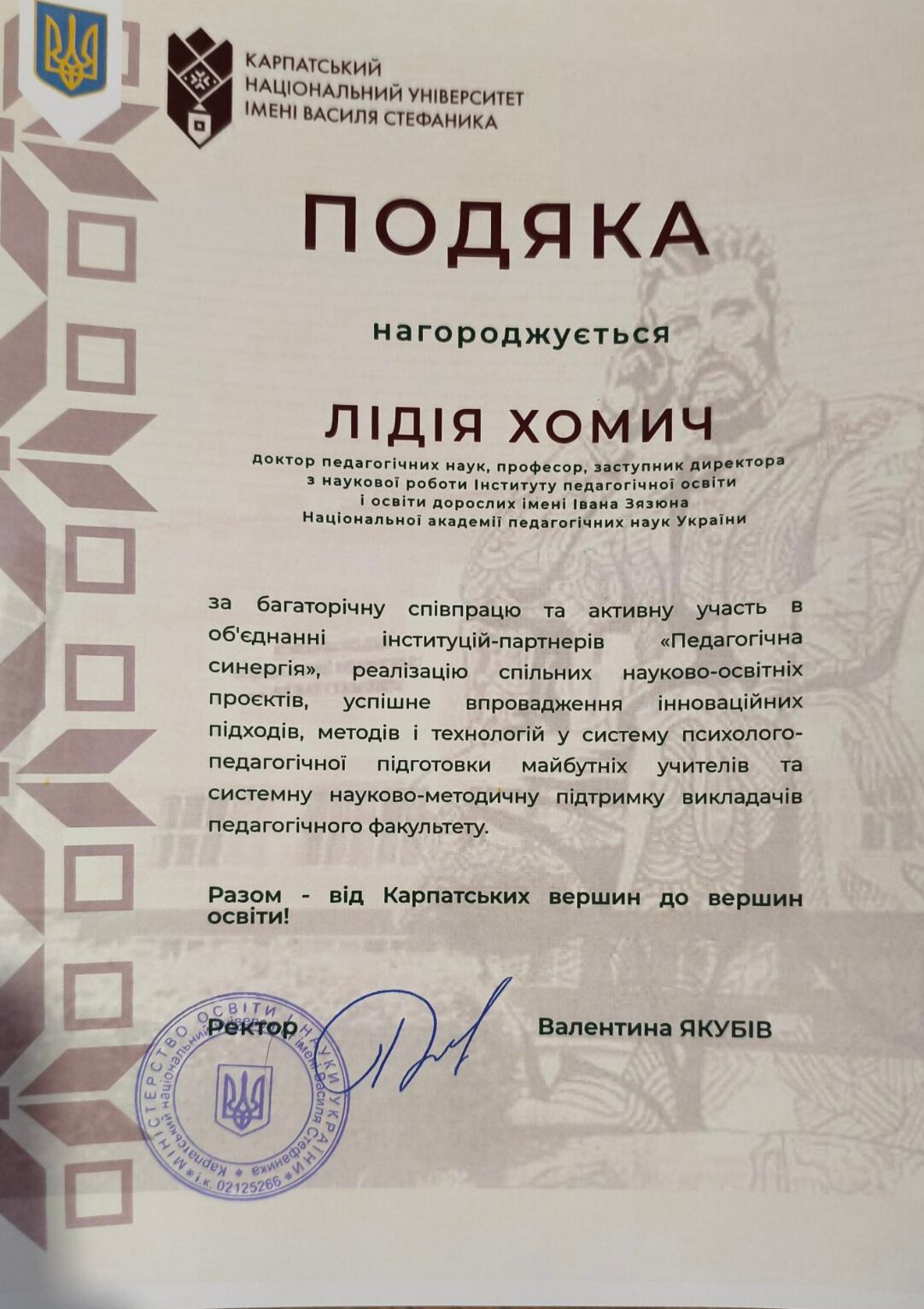 За багаторічну плідну взаємодію та активну участь в об’єднанні інституцій-партнерів «Педагогічна синергія», реалізацію спільних науково-освітніх проєктів, успішне впровадження інноваційних підходів, методів і технологій у систему психолого-педагогічної підготовки майбутніх учителів, а також за системну науково-методичну підтримку викладачів педагогічного факультету подяками було відзначено: