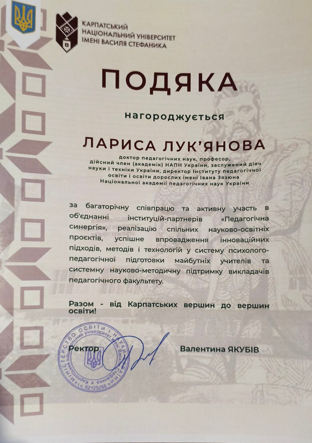 ЛАРИСУ ЛУК’ЯНОВУ − доктора педагогічних наук, професора, дійсного члена (академіка) НАПН України, заслуженого діяча науки і техніки України, директора Інституту педагогічної освіти і освіти дорослих імені Івана Зязюна Національної академії педагогічних наук України.
