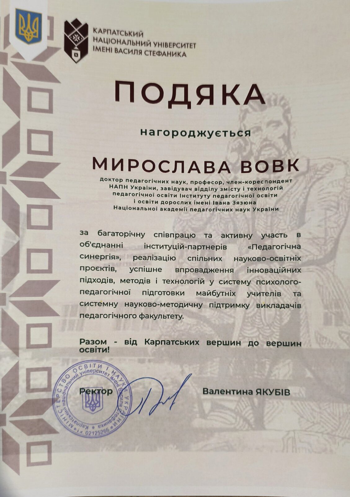 МИРОСЛАВУ ВОВК − доктора педагогічних наук, професора, член-кореспондента НАПН України, завідувача відділу змісту і технологій педагогічної освіти Інституту педагогічної освіти і освіти дорослих імені Івана Зязюна Національної академії педагогічних наук України.