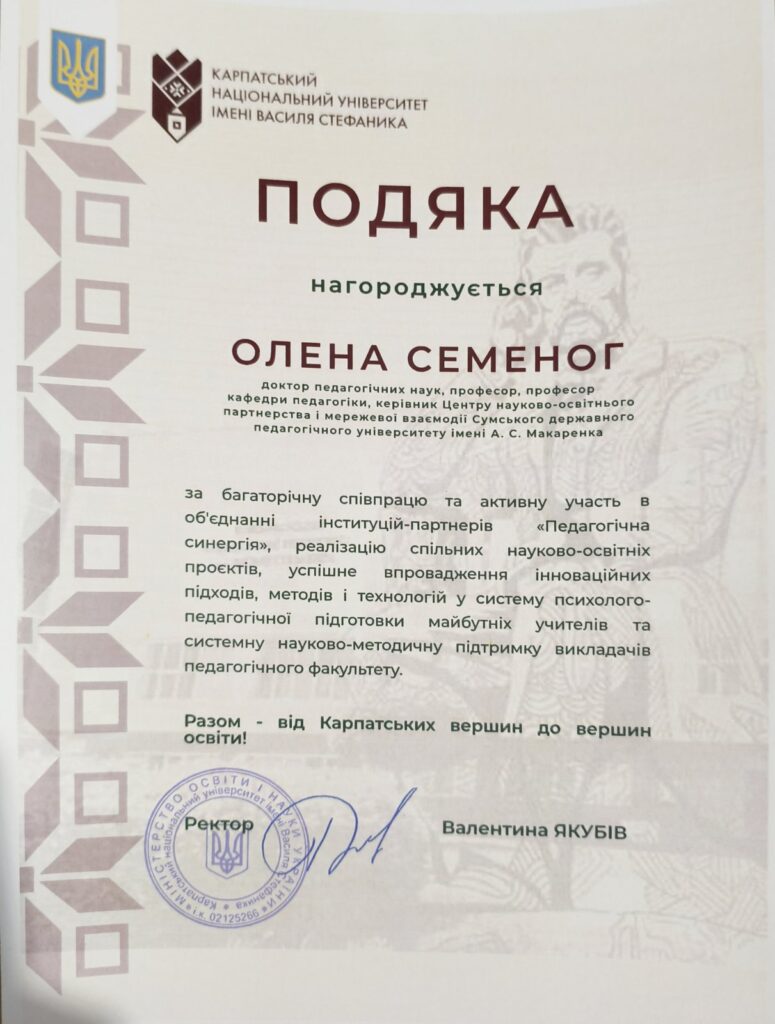 За багаторічну плідну партнерську взаємодію та активну участь в об’єднанні інституцій-партнерів «Педагогічна синергія», реалізацію спільних науково-освітніх ініціатив, успішне впровадження інноваційних підходів, методів і технологій у систему психолого-педагогічної підготовки майбутніх учителів, а також за системну науково-методичну підтримку викладачів педагогічного факультету подякою відзначено Олену Семеног, доктора педагогічних наук, професора, професора кафедри педагогіки, керівника Центру науково-освітнього партнерства і мережевої взаємодії Сумського державного педагогічного університету імені А. С. Макаренка.