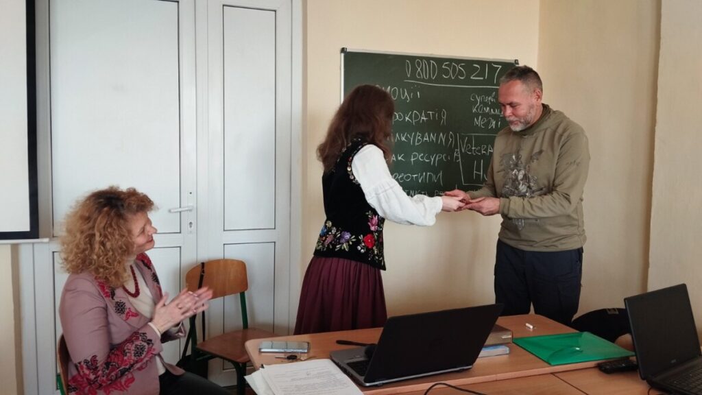 Гостями заходу були Олена Дудзенко – психологиня, керівниця Ветеранського простору БО «Перший добровольчий хірургічний шпиталь» в Івано-Франківську, та Гліб Тимошенко – офіцер 4 центру рекрутингу Сил ТрО ЗСУ у м. Івано-Франківськ. Особливим і надзвичайно зворушливим моментом читань став щирий, глибокий, людяний виступ Гліба Тимошенка. Офіцер поділився власними роздумами про силу мотивації, про важливість підтримки тих, хто повертається з фронту, і про те, як важливо для захисників відчувати турботу суспільства. Стрижнем дискусії обрано тезу про те, що підтримка захисників – тривалий процес, який потребує професіоналізму, емпатії, глибокого людського розуміння. Для студентів – майбутніх соціальних працівників – ця розмова стала цінним професійним уроком, нагадуванням про відповідальність перед ветеранами, їхніми родинами, всіма, хто пережив травматичний досвід війни. На знак поваги, вдячності та як символ духовного оберега Наталія Сабат подарувала військовому виготовлену студентами вервицю – щирий знак підтримки й молитви.