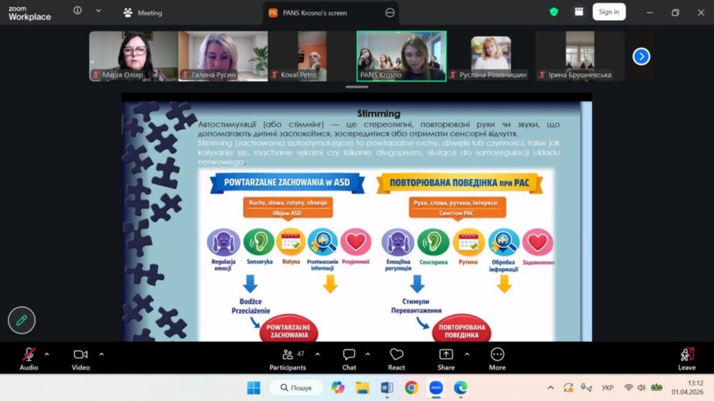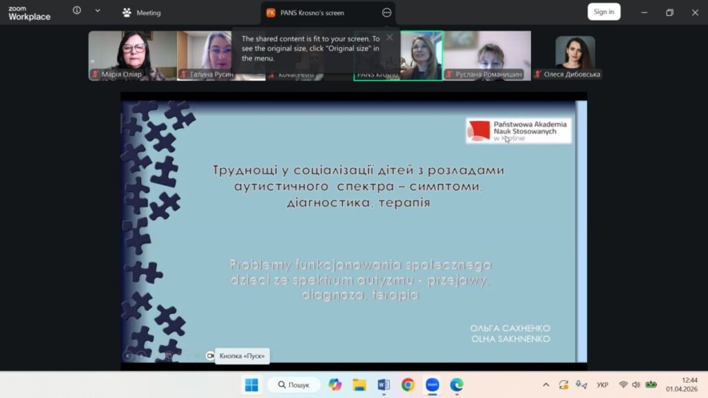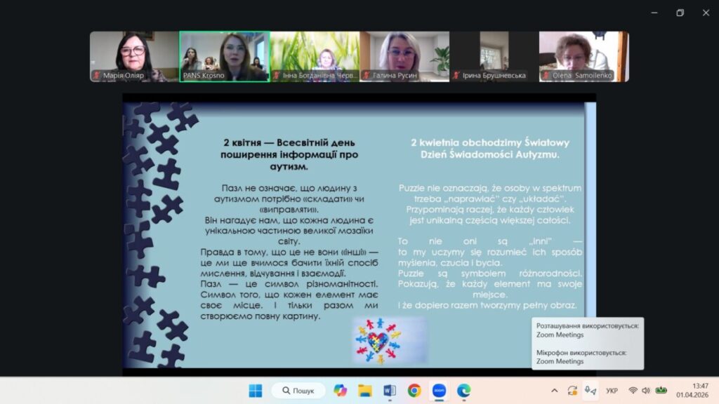 1 квітня 2026 р. напередодні Всесвітнього дня поширення інформації про аутизм на педагогічному факультеті з ініціативи професорів кафедри початкової освіти та освітніх інновацій Галини Русин та Марії Оліяр відбувся навчально-методичний воркшоп з інклюзивної педагогіки на тему «Проблеми соціального функціонування дітей з розладами аутистичного спектру: симптоми, діагностика, терапія». Модератори заходу – докторка Беата Пєхота та студентка 2 року навчання факультету педагогіки спеціальності «Соціальна опіка з педагогічною терапією» Ольга Сахненко з Державної академії прикладних наук в м. Кросно (Республіка Польща). У воркшопі, окрім студентів з польської академії, взяли участь викладачі та здобувачі вищої освіти з українських університетів-партнерів, а саме: Волинського національного університету імені Лесі Українки, Ніжинського державного університету імені Миколи Гоголя, Рівненського державного гуманітарного університету.