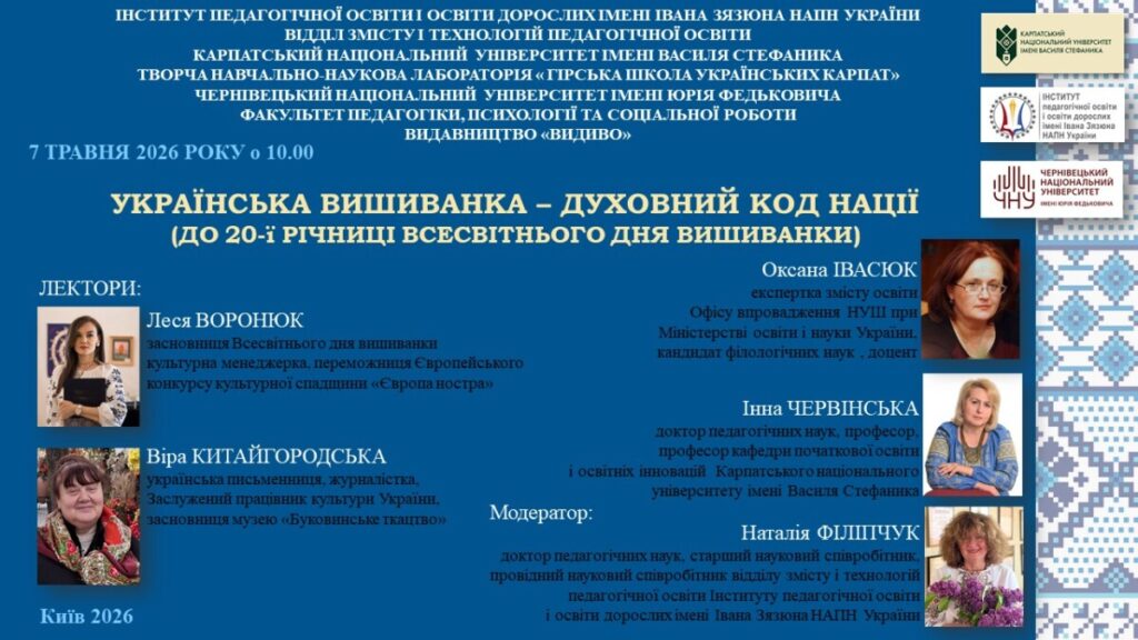 Запрошуємо долучитися до онлайн гостьової лекції «УКРАЇНСЬКА  ВИШИВАНКА – ДУХОВНИЙ КОД НАЦІЇ» з нагоди 20-ї річниці Всесвітнього  дня вишиванки, яка відбудеться у межах серії просвітницьких вебінарів та  онлайн гостьових лекцій «Цвіт української педагогіки: сучасне і минуле».